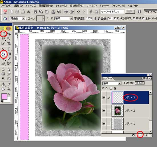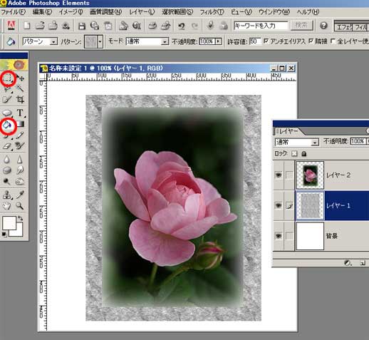 | 3.カンバスに新規レイヤーを重ね、そこに長方形選択ツールで 2.で開いた写真より 大きめの四角形を描き塗りつぶしツールで好みの色またはパターンで塗りつぶします。 長方形の選択範囲を解除して、そのレイヤーの上に薔薇の写真を移動ツールを使って 移動します。 |