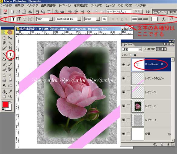 | 6.文字ツールをクリックして文字をどこでも任意の場所に書きます。 移動ツールとバウンディングボックスでリボンの上に重ねます。 |