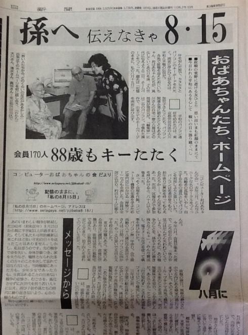 | 八月の思い出 1998年の夏「記憶のままにー私の8月 15日」という私たちの戦争体験を初めて孫にインターネットで残しておこうと会員と一緒に作りました。 世界中から400通もの若者からのメールが届き国内外からたくさん報道されました。 下の新聞報道が8月3日に掲載され一週間後の同じページに同じ大きさで「孫は受けた」と孫たちのメールが載りました。 インターネットの効果でしょうか |