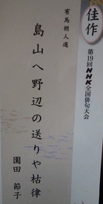 | ■ | おめでとうございます。 園田節子さまの俳句が平成26年度NHK全国俳句大会で秀作に入選されました。 正木ゆう子選 秀作 母乳飲む小鹿の脚の力かな 金子兜太 選 佳作 母乳飲む小鹿の脚の力かな |