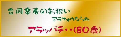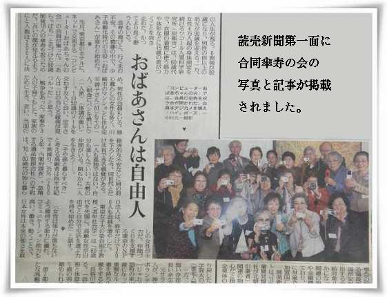 平成21年3月4日、春の全国50人のオフ会を 六本木 リッツカールトン東京ホテルで開きました。 その席上、80歳前後の会員の合同傘寿の祝を開きました。 名づけて元気いっぱい 「アラッパチ」 読売新聞社が「おばあちゃんは自由人」と一面に写真掲載 |