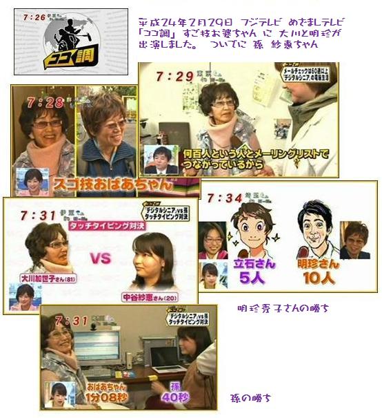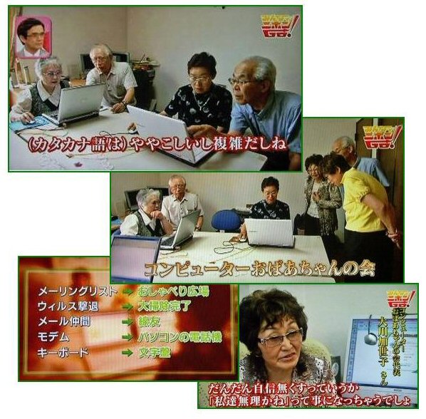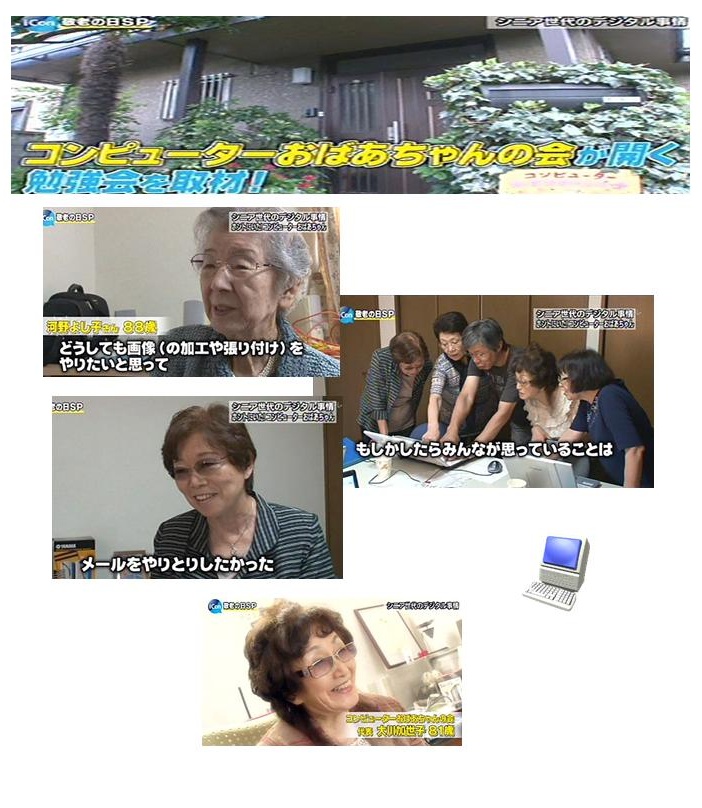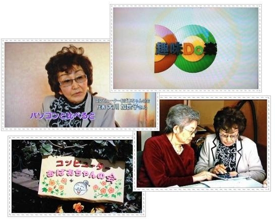 | 16年6月20日(日)「NHKジュニアスペシャル」番組、 テクノロジーヘの挑戦が当会のドレミパソコンサロンを取材し、小学6年生の蓮華ちゃんが、おばあちゃんたちのパソコンの作曲、演奏の楽しさをインタビューし放映されました。 (NHK教育テレビ) |