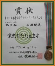 ■おめでとうございます。 平成22年4月11日岡崎市体育協会主催のグランド・ゴルフ大会で700人の参加者の中で入賞され賞状とメタルを頂きました。 「継続は力なり」続けていることの大切さと喜びを感じられたそうです。 |