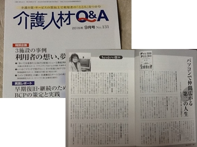 | 産労総合研究所発の介護人材Q&A誌 2015年9月号「ちょっといい話」欄に ”パソコンで仲間広がる第二の人生” と題して大川が執筆しました。 |