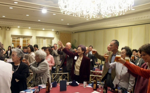 | ■ | 平成14年9月25日東京帝国ホテルにて、秋のオフ会を開催 乾杯の音頭をとって下さいましたのは、参加会員の最高齢90歳の松本さんです。わらべ唄の合唱は懐かしい昔にかえりました。 |