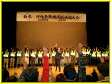 | 平成24年1月27日世田谷区・成城警察署主催 「特殊詐欺撲滅総決起大会」に会員と一緒に参加しました 同区在住の八千草薫さんと警察幹部との対談、 女子署員による腹話術など楽しい時を過ごしました。 成城大学他の若い学生ボランティア(SVS)と共に 「エイエイオー」とおれおれ詐欺撲滅を誓いました。 |