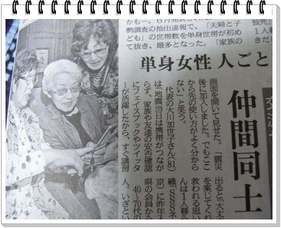 | 23年7月、8月に東京新聞、信濃毎日新聞、京都新聞、中日新聞、 山形新聞、茨城新聞、北海道新聞、毎日新聞等に深夜便オフ会 の写真と記事が掲載されました。 震災孤独死 自衛の輪 「皆でITを使って繋がろう」ツイッター・フェイスブック |