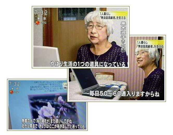 | 2010年5月2日 NHK総合テレビ「おはよう日本」で ・・独り暮らしの無会話高齢者を支える・・ 番組で会員が、全国メール交流の楽しさを伝えました。 |