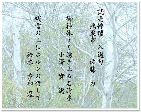 | ■ 読売新聞社俳壇 小澤 實 選 平成24年7月30日 読売新聞社俳壇 鈴木章和 選 平成24年7月20日 入選句 佐藤 力 様 |