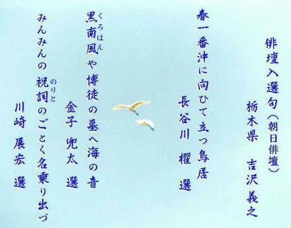| ■朝日新聞社俳壇 長谷川櫂 選 平成14年2月25日 朝日新聞社俳壇 金子兜太 選 平成15年6月30日 朝日新聞社俳壇 川崎展宏 選 平成16年8月23日 入選句 吉澤義之様 |