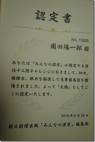 | 高齢者とは漢字が好きな方が多いですね。現在総挑戦者数5,003人「序二段に昇格は3,963人、朝日新聞社「みんなの漢字」編集部から2016年5月25日 No.1526園田陽一郎殿 十二段階チャレンジにおきまして、最高位「大徳」としてここに認定します。 |